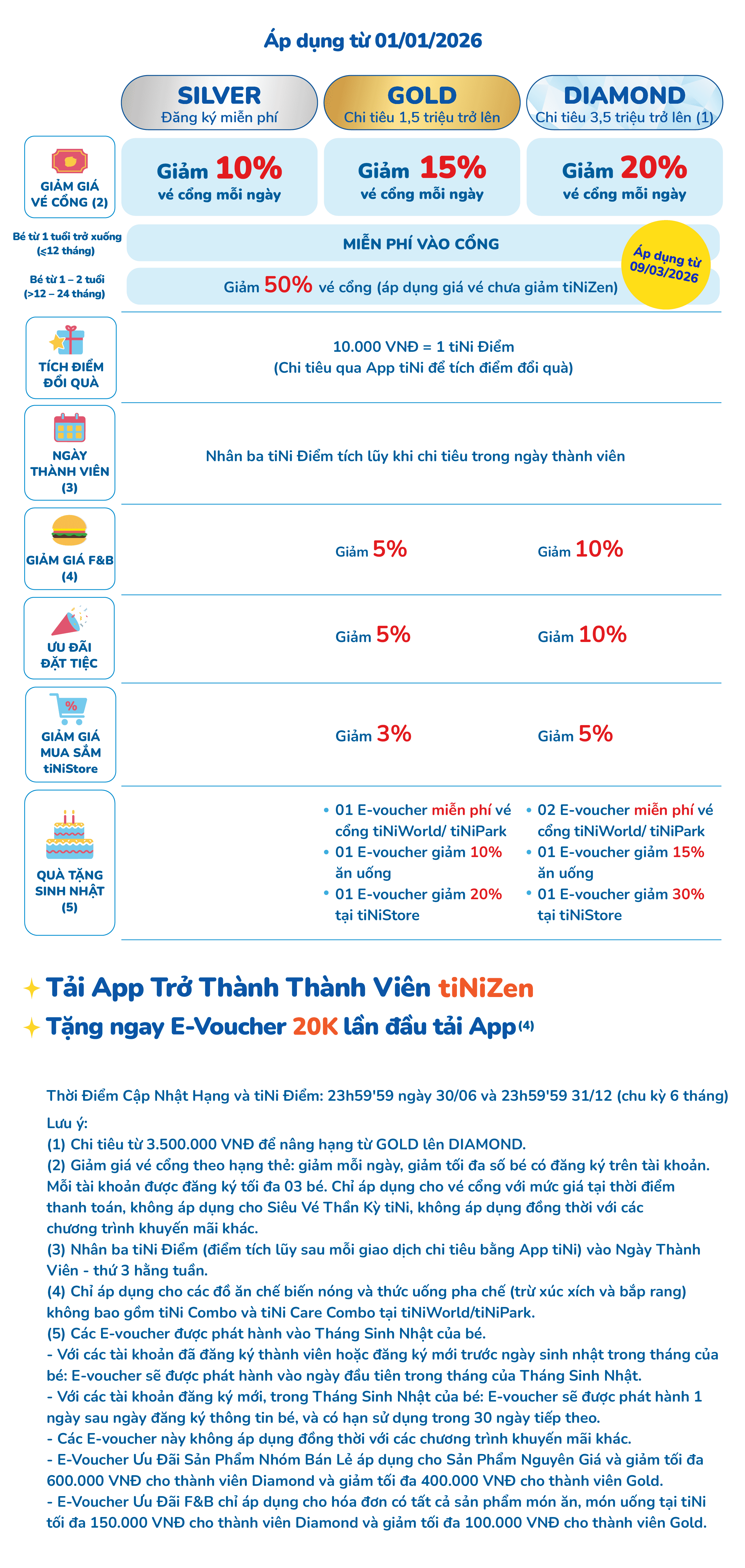- Ưu đãi F&B: chỉ áp dụng cho hóa đơn có tất cả sản phẩm món ăn, món uống tại tiNi. Giảm tối đa 150.000VNĐ cho thành viên Diamond và tối đa 100.000 VNĐ cho thành viên Gold.